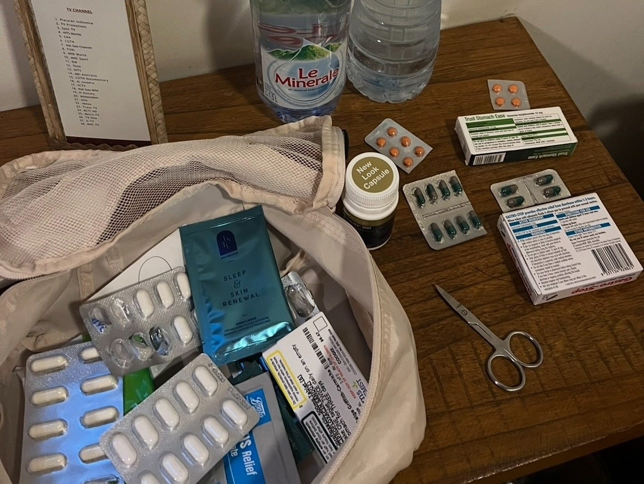 Emergency health kit - Travelan, probiotics, Ural, Gastro Stop, prescription medications and pain killers (you should also pack a smaller version of this in your carry on)